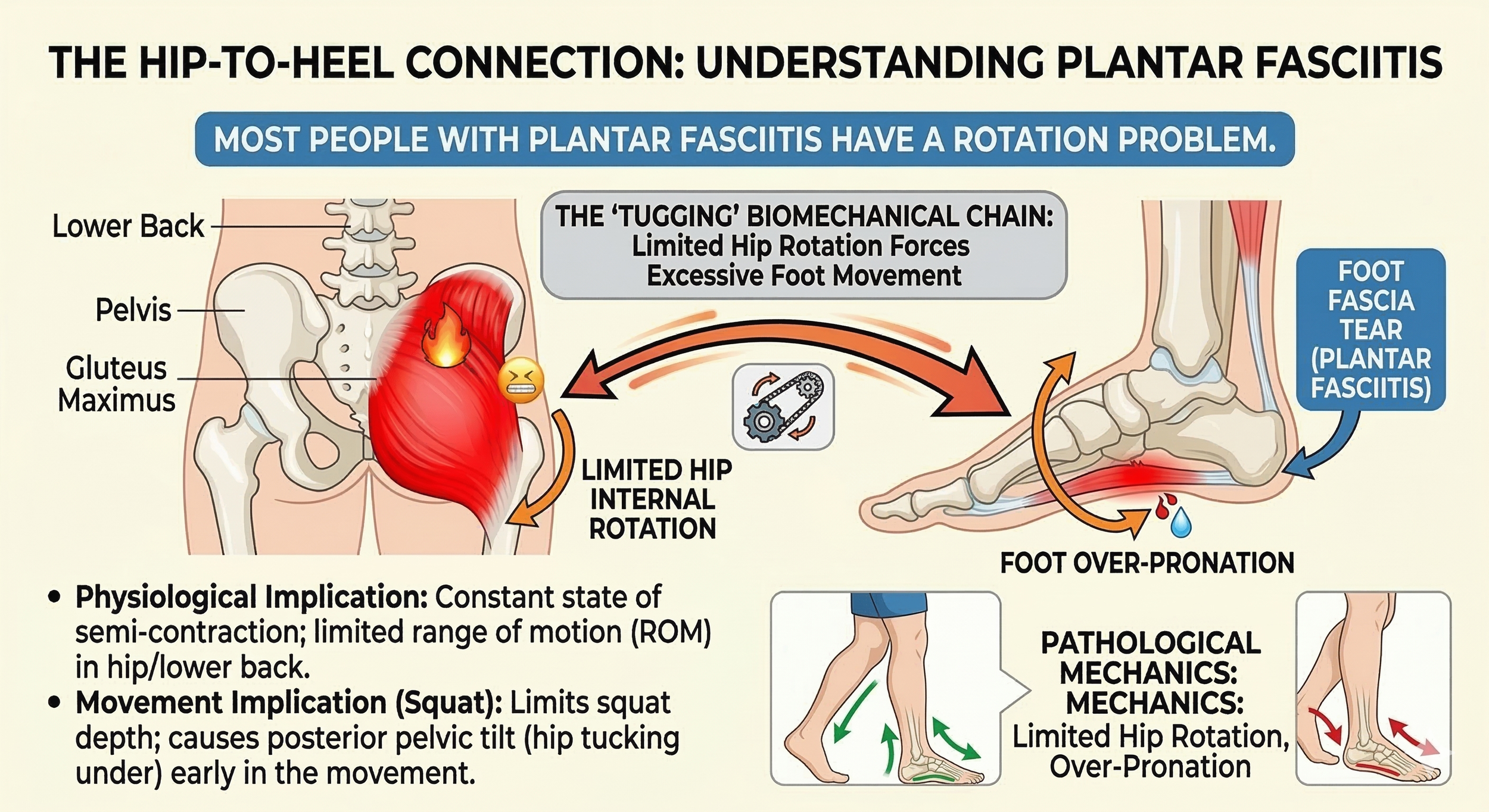 If your hip doesn't rotate internally as you walk, your foot is forced to over-pronate (collapse) to find that missing range of motion. This constant "tugging" on the arch is what leads to a strained gluteal muscle and a concurrent foot fascia tear. They are two sides of the same mechanical coin.