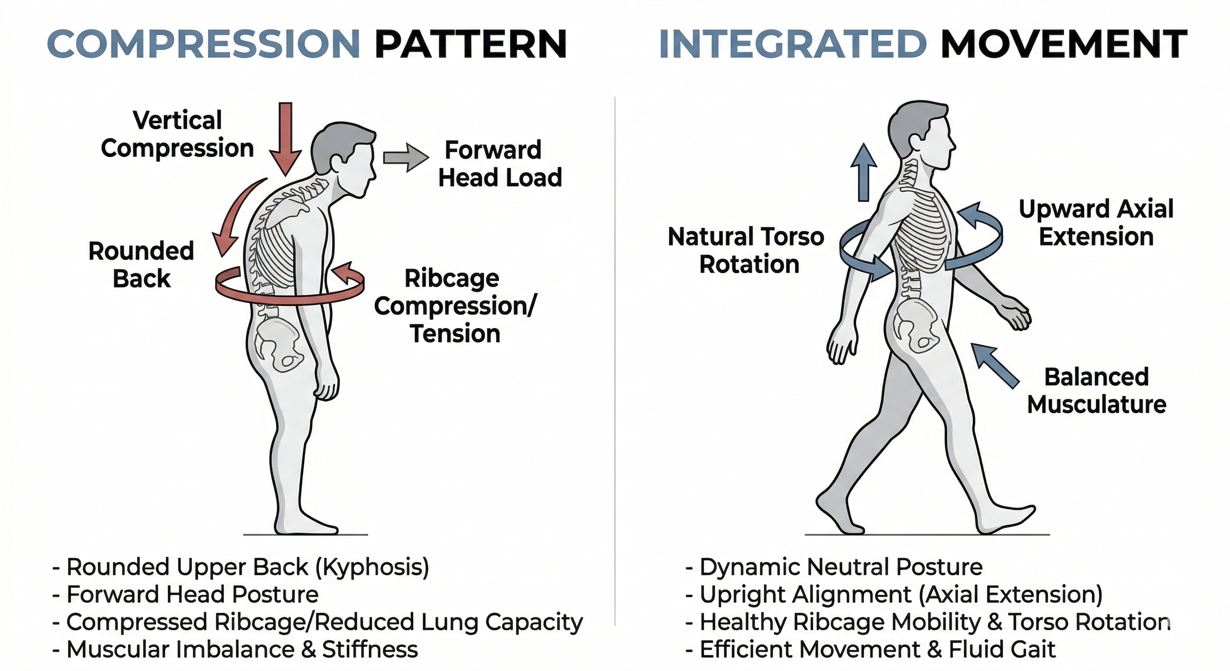 Instead of moving through space, your body starts to hold itself together. The ribcage becomes more rigid. The upper back stiffens. The shoulders round forward. The neck starts doing more work than it should.